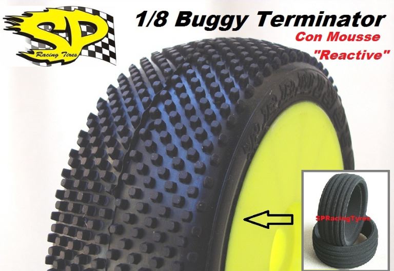 Sono le Nuovissime gomme 1/8 Buggy TERMINATOR di fabbricazione SP racing, già incollate su cerchio diametro 83mm.