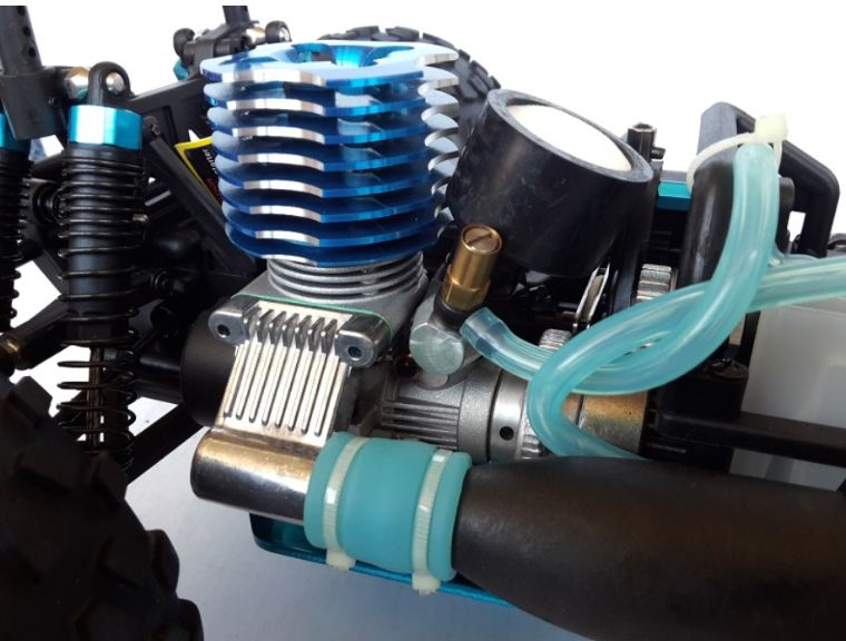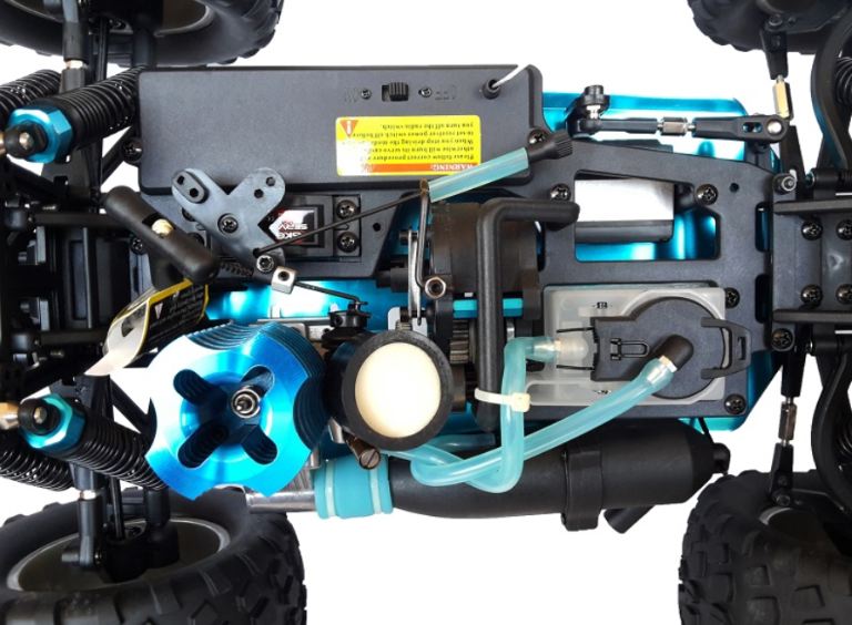 Il potente **motore da 3cc con avviamento a strappo**, montato su robusto **chassis in alluminio completamente cuscinettato**, assicura accelerazioni brillanti e grande affidabilità. I **doppi paraurti con sistema a molla** riducono il rischio di rotture in caso di urti, rendendolo ideale per un utilizzo intenso.