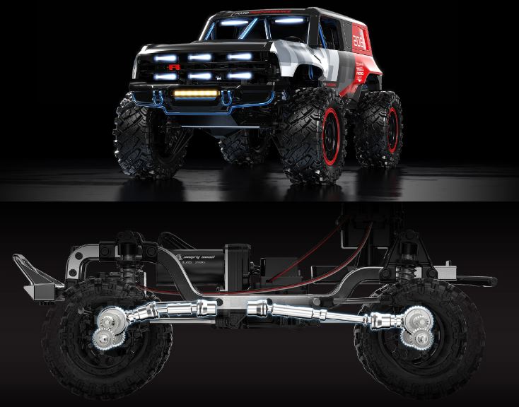 L’MJX Hyper GO H12P (Ford Bronco R Baja1000) è un crawler in scala 1/12 fedele nei dettagli con trasmissione brushless, robusto telaio a longheroni in metallo e carrozzeria in ABS in scala con licenza. Assali a portale (trasmissione Gate-Bridge), un servo con ingranaggi in metallo da 20 kg e ammortizzatori in metallo riempiti d’olio garantiscono una trazione controllata e un’arrampicata finemente dosabile su roccia, ghiaia o sentieri forestali. Il regolatore brushless da 45 A (E45M) in combinazione con il motore 3650 fornisce una coppia elevata per il crawling tecnico.