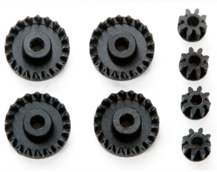 Set ingranaggi rinforzati per trasmissione 4WD delle mini4WD. Il set include ingranaggio G13 e pignone 8T (4 pezzi per tipo) in carbon fiber rinforzato. Compatibile con i telai: AR, VS, Zero, Super I, Super II, Super TZ e Super TZX.