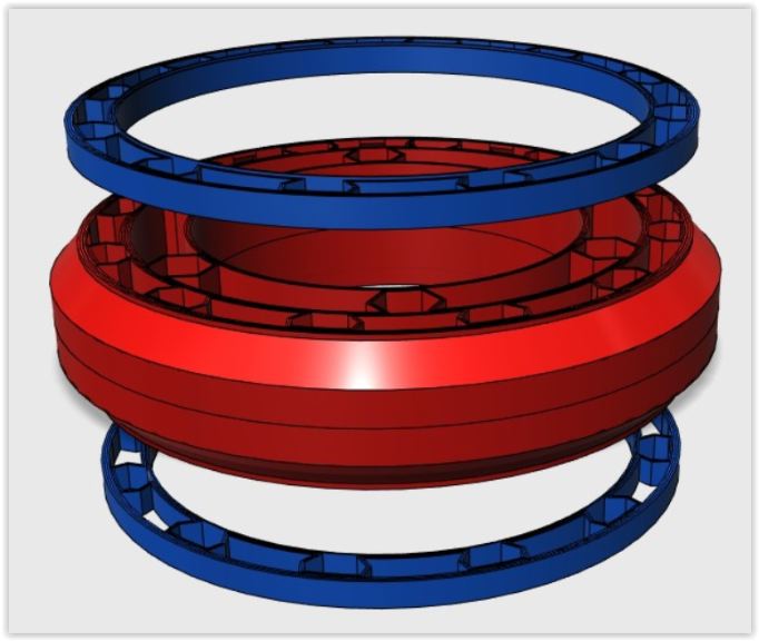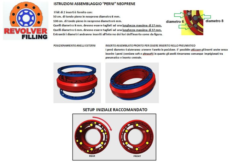 Assemblaggio dei 2 anelli sullinserto. Essendo imprigionati tra pneumatico e inserto centrale lutilizzo dei perni in neoprene è facolativo. Sarà quindi possibile ottenere tutte le possibili varianti dalla soft (senza perni in neoprene) alla hard (con tutti i perni in neoprene).