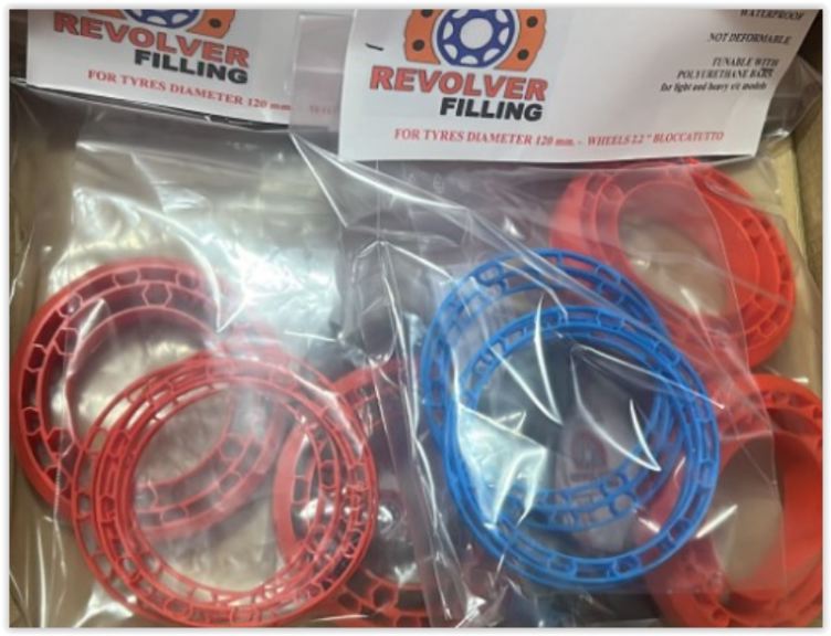 Laggiunta dei 2 anelli esterni che si bloccano in sede grazie ai perni in neoprene permette di avere la corretta larghezza allinterno della spalla del penumatico. (il colore blu degli anelli nelle immagini è puramente indicativo. Il materiale degli anelli è identico a quello dellinserto.)