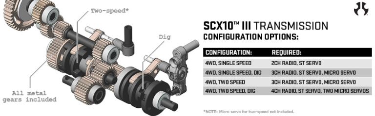 La trasmissione SCX10 III Jeep JLU Wrangler è dotata di una funzione DIG a terzo canale che consente di bloccare l’asse posteriore dal trasmettitore per la trazione anteriore e un raggio di sterzata più stretto. In alternativa, è possibile impostare il veicolo con una trasmissione a due velocità e scegliere tra alte e basse velocità. Se si desidera utilizzare sia la trasmissione a due velocità che la funzione DIG, è sufficiente aggiungere un altro servo e una radio con almeno quattro canali (come la Spektrum™ DX5 a 5 canali).