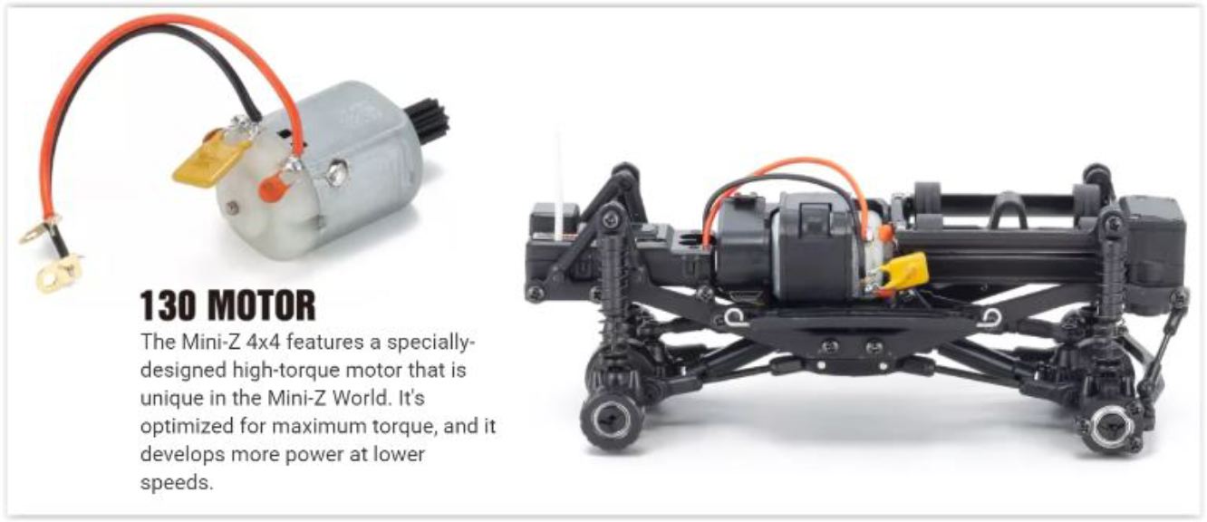Il telaio è lo stesso in scala dei veicoli 4WD reali, la MINI-Z 4×4 vanta una sospensione ad asse rigido a 3 maglie che combina quelli che normalmente sarebbero due maglie superiori in un unico braccio A superiore per offrire il massimo movimento di sospensione. Un servo dello sterzo ad alta coppia, appositamente progettato, consente a questa macchina di ottenere prestazioni eccellenti nelle condizioni più dure dei rock-crawler. Il motore ad alta coppia 130 mette in evidenza la bestia della MINI-Z 4×4, appositamente studiato per funzionare bene nelle gamme di velocità medio-basse comuni nel crawling.
