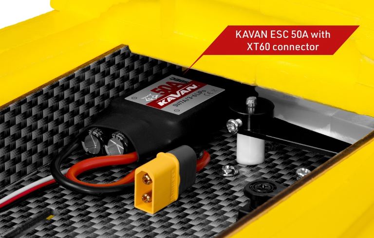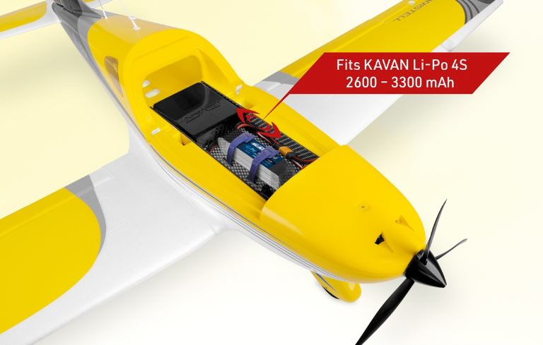 La fusoliera in schiuma EPO, rinforzata con carbonio, è dotata di motore brushless KAVAN C3548-800, elica tripala 10×6 e regolatore elettronico KAVAN R-50SB con un potente stabilizzatore SBEC switching necessario per alimentare tutti i 7 servi a bordo. La calotta è amovibile e fissata con uno spinotto nella parte anteriore e due chiusure posteriori. Il vano dell’abitacolo offre molto spazio per il ricevente e la batteria di volo.