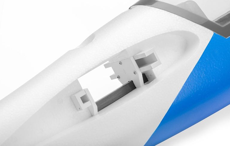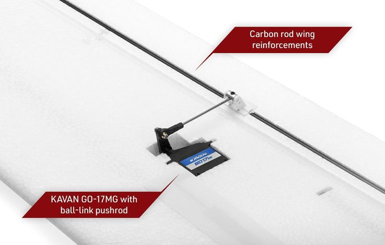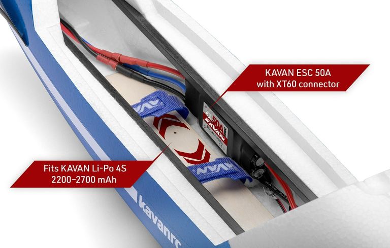 La fusoliera in schiuma EPO, rinforzata con carbonio, è dotata di motore brushless KAVAN C3548-750, elica pieghevole 11×8 e regolatore elettronico KAVAR R-50SB con un potente stabilizzatore SBEC switching necessario per alimentare tutti i 4 servi ad alta coppia installati a bordo. La calotta è amovibile e fissata con un blocco magnetico. Il vano dell’abitacolo offre molto spazio per il ricevente e la batteria di volo. I servi dell’elevatore e del timone sono installati nella deriva.