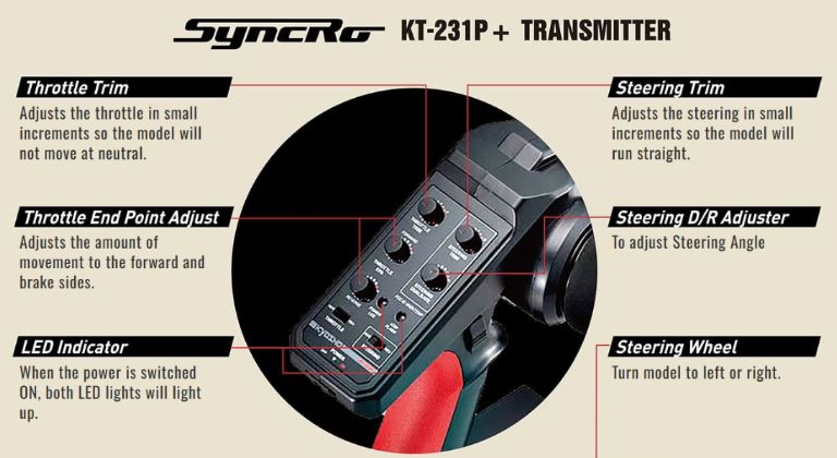 – Include trasmettitore a pistola Syncro 2.4GHz KT-231P+ con impostazioni regolabili.