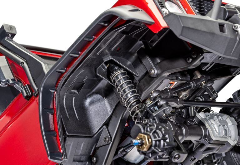 Il telaio del TRX-4 e’ progettato per resistere ai maltrattamenti dei terreni piu’ remoti e difficili, ed assicurarvi intere giornate di divertimento. Le basi sono i tiranti-longheroni da 1,5 mm di diametro, con giunti sovradimensionati che danno stabilita’ e robustezza alle sospensioni. I semiassi omocinetici in acciaio indurito sono ultra-affidabili, mentre le riduzioni a portali in acciaio sulle ruote ed i loro contenitori sono scorrevoli e silenziose. Tutti i materiali compositi stampati ad iniezione sono statimesi a punto con l’esperienza trentennale di Traxxas inquesto settore.