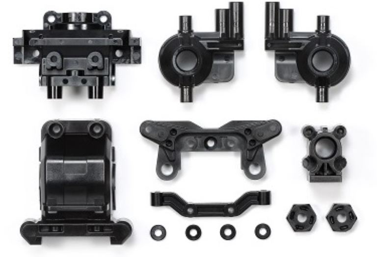 Montanti, coperchio ingranaggi, supporti delle sospensioni, ammortizzatore, mozzi esagonali e altri componenti.