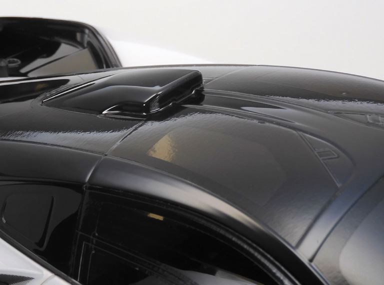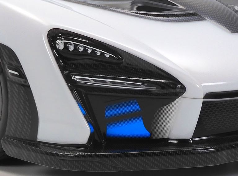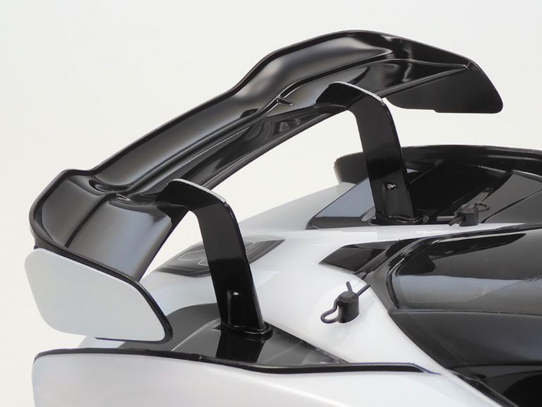 • La forma della McLaren Senna è fedelmente riprodotta in policarbonato trasparente ed alettone e specchietti retrovisori sono realizzati in ABS nero.