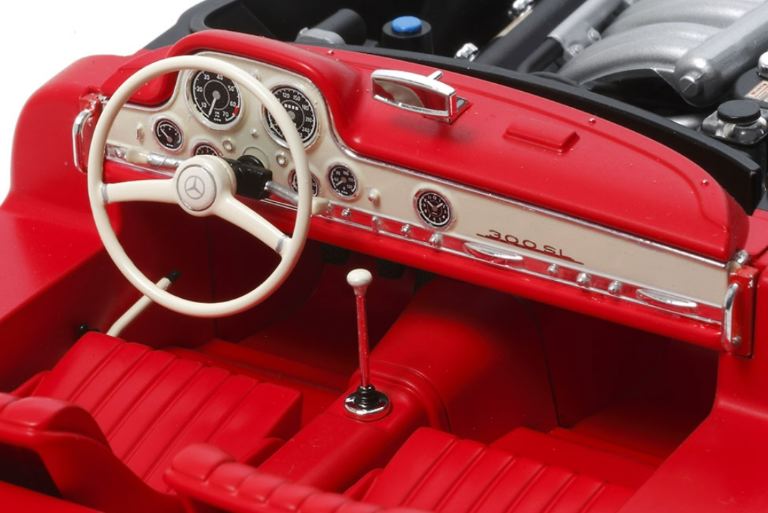 • L’elegante silhouette della 300 SL è catturata dalle parti trasparente della carrozzeria, del cofano motore e delle portiere ad ala di gabbiano che possono essere assemblati non verniciate per consentire l’apprezzamento dei dettagli sottostanti.
