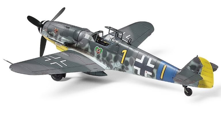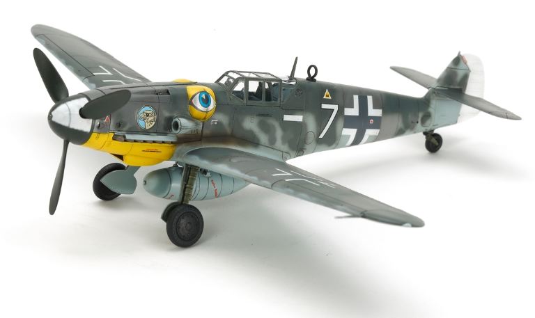 Si tratta di una replica del modello Tamiya del Messerschmitt Bf109, che è stato il caccia più prolifico della storia delle sue varianti, il G-6 è stato il più numeroso con 13.000 aerei. In risposta al miglioramento dei nemici alleati in volo, i Bf109 G avevano il più potente motore DB605, e dal G-6 erano equipaggiati con due mitragliatrici MG131 da 13 mm che richiedevano i caratteristici rigonfiamenti su entrambi i lati del cofano dell’abitacolo conosciuto come Beule . Alcuni furono persino dotati di una gondola da 20 mm sotto ogni ala per migliorare ulteriormente la potenza di fuoco. Il Bf109 G-6 fu dispiegato sia sul fronte occidentale che orientale, in particolare dominando gli avversari sovietici e continuando ad essere in servizio fino alla fine della seconda guerra mondiale.