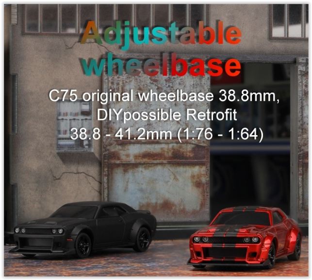 Passo regolabile da 38,8 a 41,2 mm (per carrozzerie in scala 1/76 – 1/64)