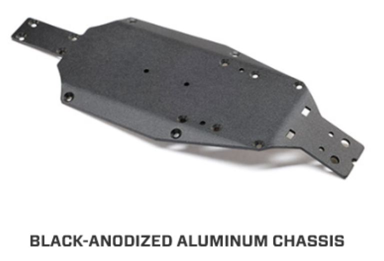 Ispirato a un buggy da corsa TLR vincitore di campionati, il telaio in alluminio anodizzato nero di livello successivo dello stadium truck Micro-T include l’angolo di incidenza anteriore e le pieghe laterali per creare una base solida e rigida.