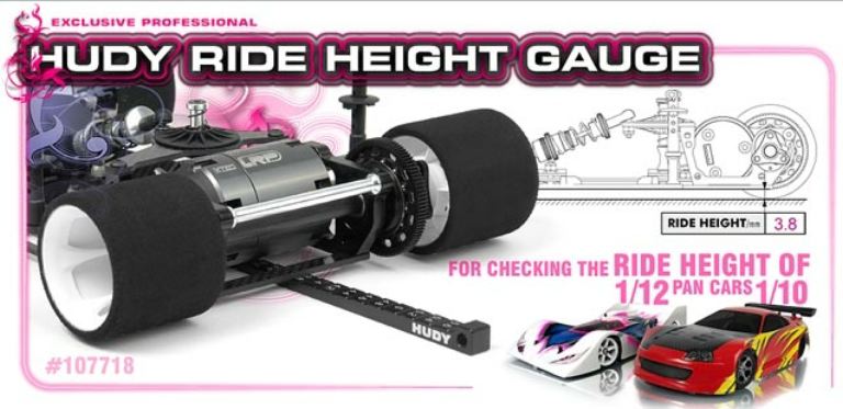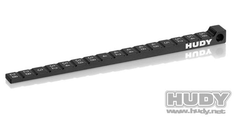 Highly-accurate precision stepped ride height gauge for checking the ride height of 1/10 & 1/12 pan cars. Stepped surfaces in the 2.6-5.6mm range have 0.2mm increments for fine adjustment. CNC-machined, premium-quality lightweight duraluminum is black elox-coating for smooth, long-lasting finish and stylish look. Laser engraved with HUDY logo and scale