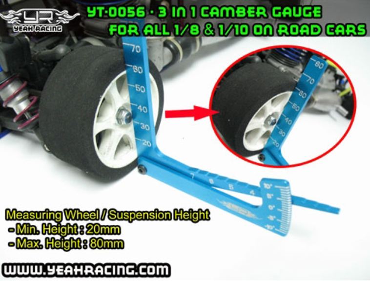 This is the Yeah Racing 3 in 1 Camber Gauge (BU) for all 1/8 & 1/10 on road car.