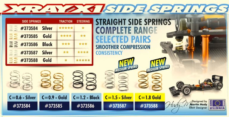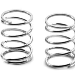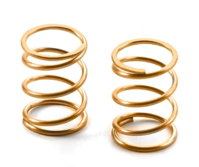 Side springs C=1.8 for pan cars and formula cars. The side springs and spring caps feature a straight design (compared to the previously-used conical springs) to improve side traction and handling. The straight springs have more consistent and smoother compression which results in smoother out-of-corner exit as well as helping to prevent traction rolling. Gold color. Set of 2.