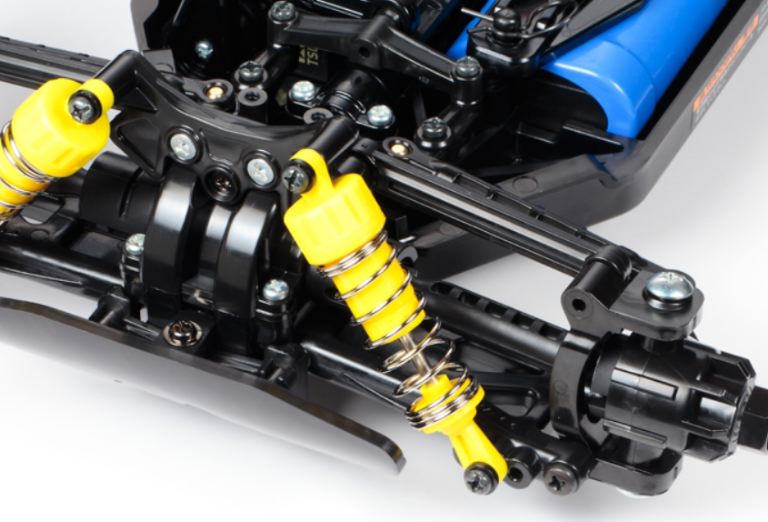 Dotato del telaio TT-02B con trasmissione cardanica 4WD di semplice costruzione e limitata manutenzione, unisce la controllabilità del telaio con pneumatici pin spike a punta quadrata per una aderenza elevata su superfici ruvide.
