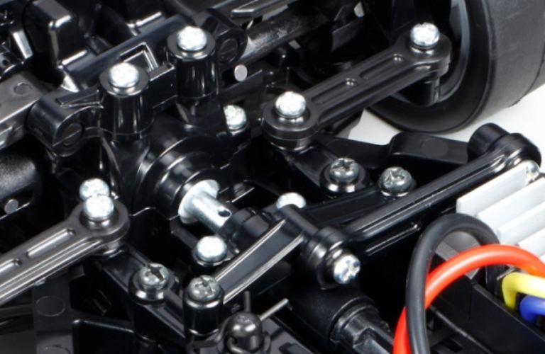 Il telaio 4WD TT-02 a trasmissione cardanica sfrutta una disposizione longitudinale con la batteria a sinistra e il motore a destra, per offrire un’eccellente stabilità. Inoltre, è dotato di bracci di sospensione e montanti sinistro e destro identici per un facile montaggio. È un telaio altamente adattabile, in quanto offre 2 diversi passi, 2 impostazioni di altezza da terra e 2 impostazioni del battistrada oltre a una gamma di 10 possibili rapporti di trasmissione.