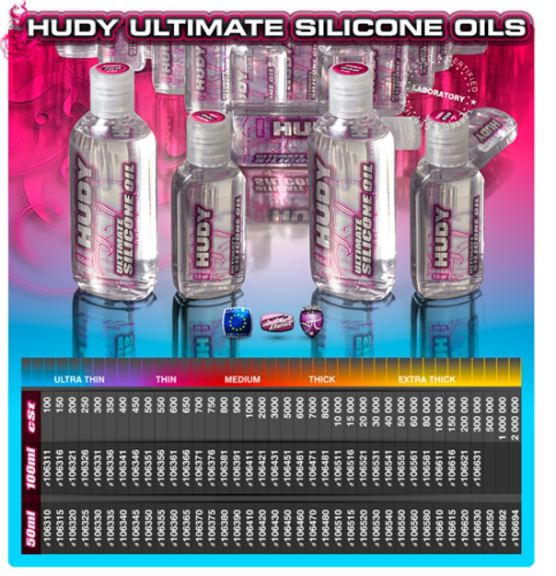HUDY oils cover the complete range from Ultra-Thin (100cSt)… Thin (1000 cSt)… Medium (5000cSt)… Thick (10.000cST)… up to Extra-Thick (1.000.000cSt), with numerous stages in between. Thinner oils are suitable for shocks (up to Medium) thicker oils are suitable for differentials. You will be able to find the correct viscosity you need for your application.