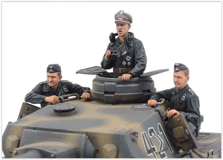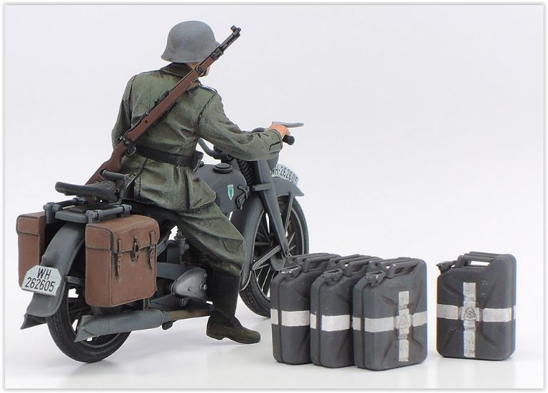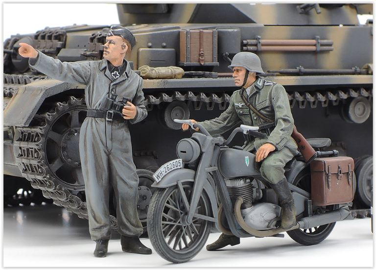 Include tre figure dallarticolo 35374 1/35 German Tank Panzerkampfwagen IV Ausf.F, due (moto pilota e ufficiale in piedi) figure e motocicletta dellarticolo 35307 1/35 German Heavy Tank Destroyer Jagdtiger Mid Production Commander Otto Carius. (Tutte e cinque le figure presentano uniformi del fronte orientale.)