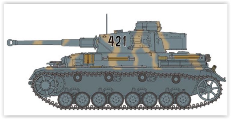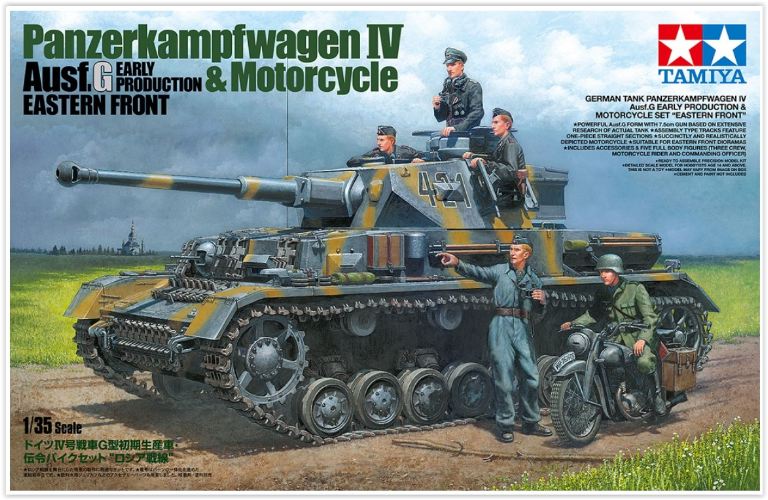 Questo set include: il carro armato tedesco Panzerkampfwagen IV Ausf.G in scala 1/35 Early Production & Set di motociclette Eastern Front oltre a tre figure dellarticolo 35374 e nuove decalcomanie, più due figure e motocicletta dellarticolo 35307.