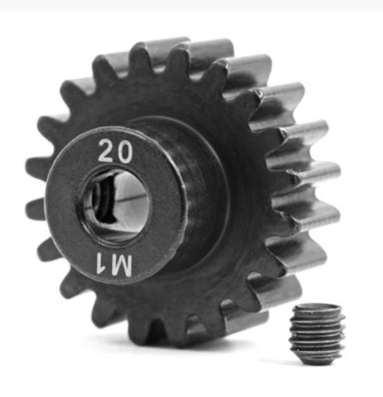 Il pignone a 20 denti (1.0 passo metrico) è lavorato in acciaio temprato per una maggiore durata e si adatta a alberi motore da 5 mm. Cambiare i rapporti di trasmissione può aiutare a bilanciare l’accelerazione e la velocità massima per diverse condizioni di corsa.