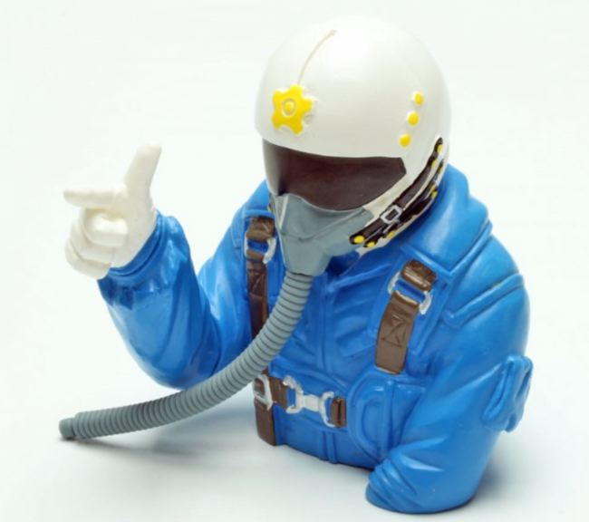 Pilota di jet in plastica dipinta a mano. Tubo dell’ossigeno in gomma.