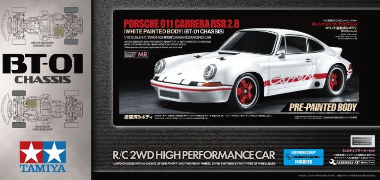 Tamiya introduce questa versione in edizione limitata dellarticolo 58740 1/10 R/C Porsche 911 Carrera RSR 2.8 (BT-01). Passo corto e motore posteriore centrale / trazione posteriore (MR). Il kit include la carrozzeria in policarbonato preverniciata in bianco (PS-1),finestrini fumé (PS-31), con passaruota pretagliati e fori di installazione pre-realizzati, che è lideale non solo per i principianti ma anche per i veterani R/C. Informazioni sul modello: