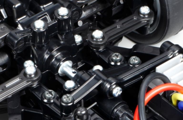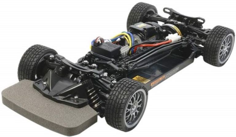 • Il modello utilizza il telaio 4WD TT-02 con trasmissione ad cardanica che offre adattabilità e stabilità superiori.