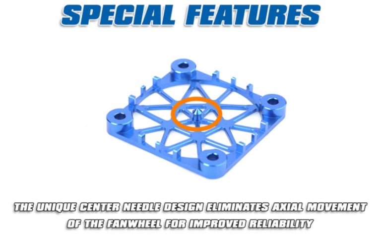 L’esclusivo design ad ago centrale elimina il movimento assiale della ventola per una maggiore affidabilità.