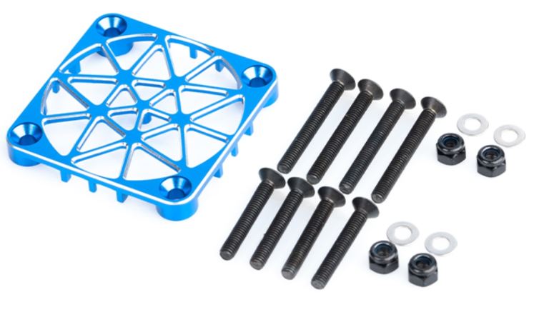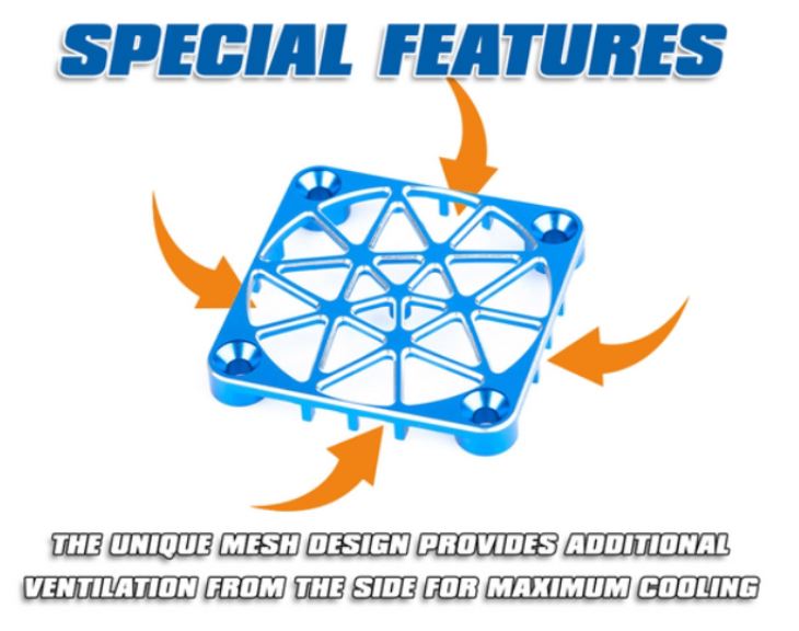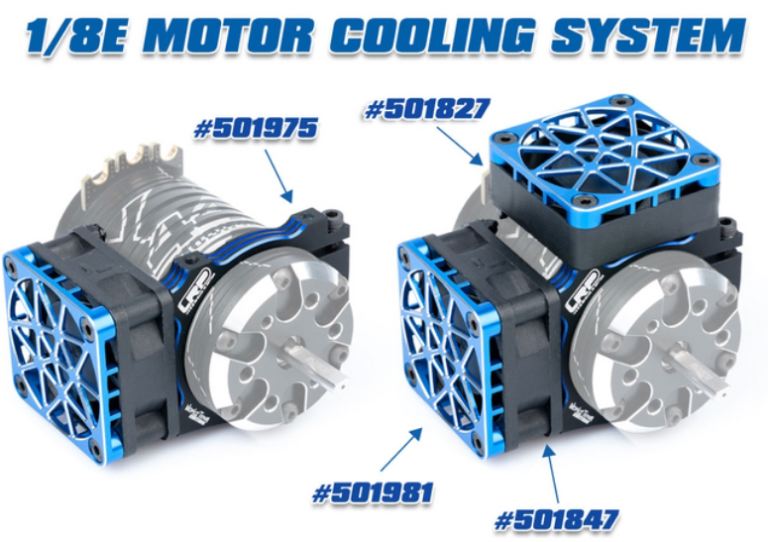 Il sistema di raffreddamento del motore 1/8E è composto dal nostro supporto per ventola in alluminio WorksTeam (#501975), dalle ventole del motore WorksTeam SuperHighRev. (#501847 / #501827) e dalla rete di sicurezza WorksTeam abbinata (#501981) per mantenere il motore fresco in qualsiasi condizione.