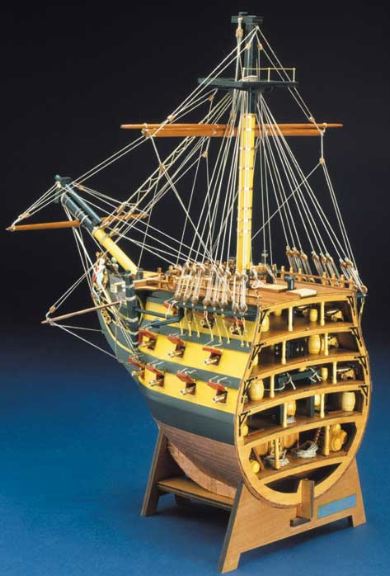 Tutti i ponti sono completamente arredati. La scatola contiene ordinate e particolari tagliati a laser, fasciame in noce, polena fusa in metallo a cera persa, cannoni di vario calibro, accessori in ottone e noce. Piastrine di rame per il rivestimento delo scafo.