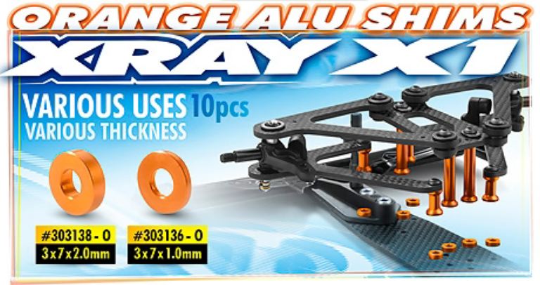 Alu shims 3x7mm, 2mm thick which can be used for various purposes. These shims can be used for ride height and roll center adjustment, they fit perfectly under the front arm mount plate and graphite lower suspension arm stands. Orange color. Set of 10.