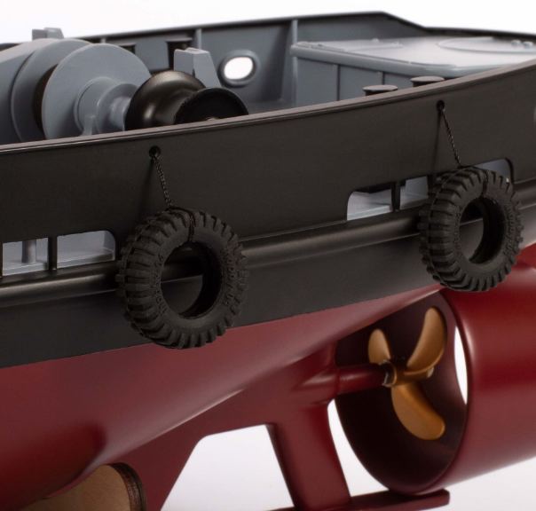 I dettagli in scala forniscono il massimo realismo possibile. Pneumatici, verricello, gru, tra gli altri accessori in scala sul ponte completano i dettagli.