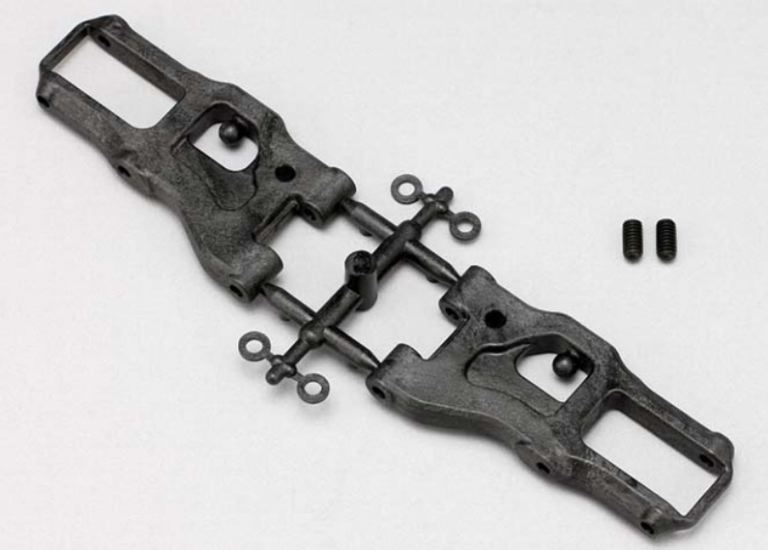 Parti opzionali per BD10, si tratta di bracci delle sospensioni anteriori stampati in grafite. La distanza tra i perni delle sospensioni è di 55 mm e la distanza dal perno interno della sospensione al perno dell’ammortizzatore è di 33 mm. Questi bracci sono più rigidi dei bracci delle sospensioni standard e possono migliorare la risposta della macchina.
