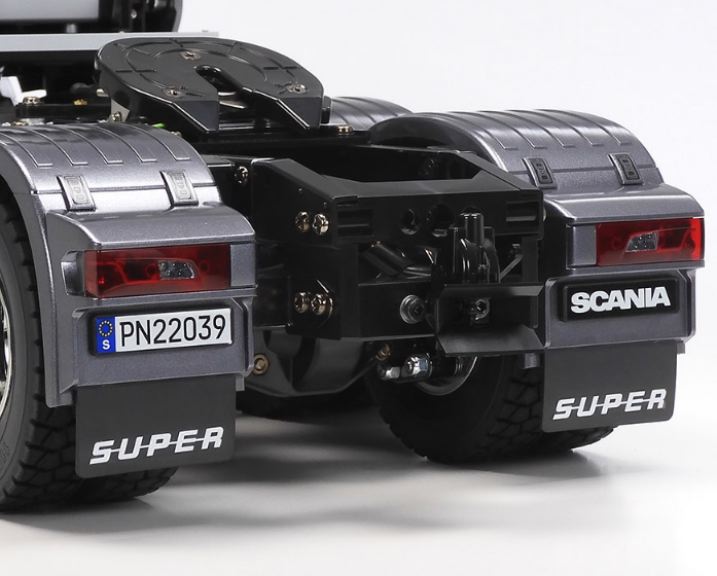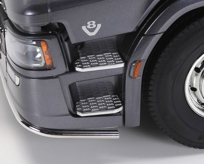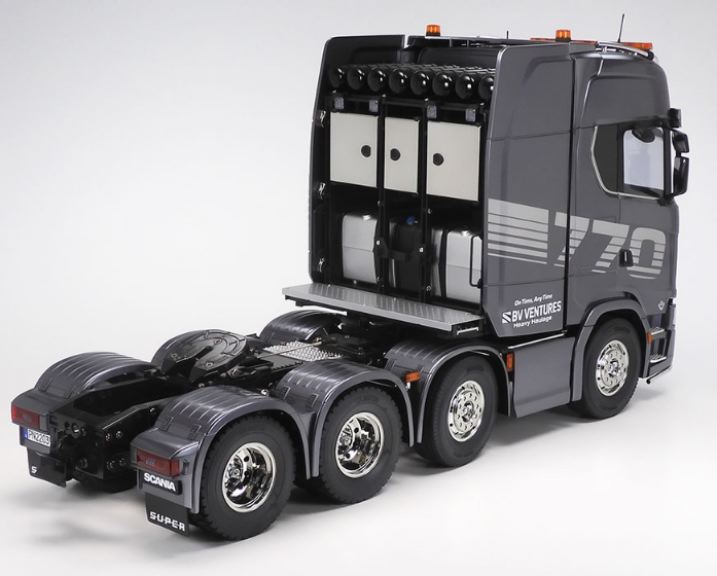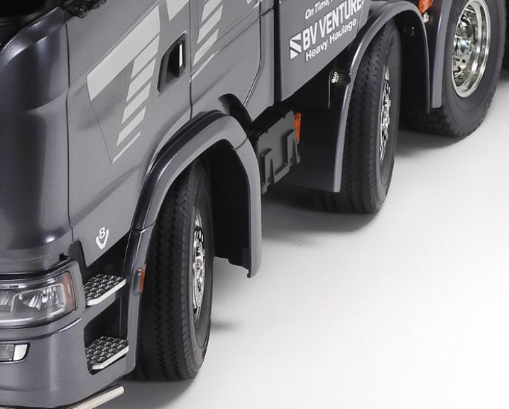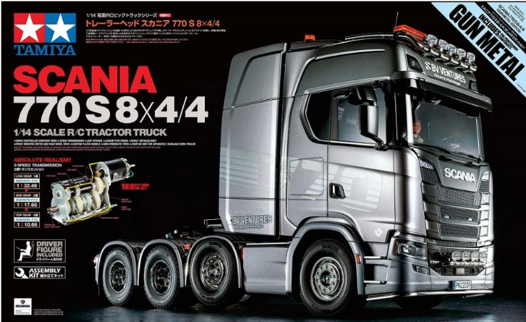 Questo kit di assemblaggio di modelli R/C ricrea il Scania 770 S 8×4/4, un trattore pesante a otto ruote con doppio asse anteriore direzionale e doppio asse posteriore motrice, equipaggiato con un motore turbo V8 da 16,4 litri capace di 770cv, aggiunto nel 2020 alla serie S di alta gamma del produttore svedese Scania. Il modello ha una cabina altamente realistica che – insieme ai deflettori laterali, al tetto, al paraurti e ad altre parti – è pre-verniciata in colore metallo scuro. All’interno della cabina si trova un interno con cruscotto arrotondato e altri dettagli. Il suo telaio presenta un telaio a scala con canali laterali in alluminio, e la potenza è trasmessa ai due assi posteriori tramite una trasmissione a 3 velocità, mentre i due assi anteriori sono sterzati da un singolo servo il secondo asse è un asse di sollevamento che può essere sollevato e abbassato manualmente.