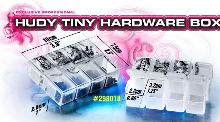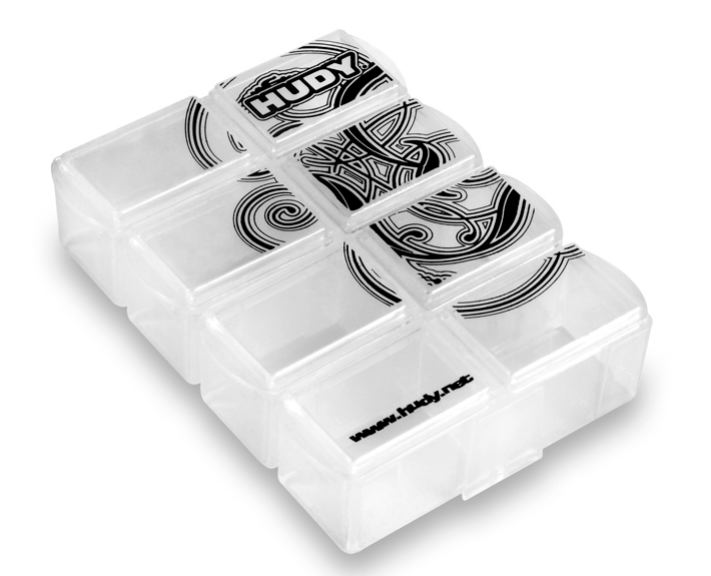 Very handy and useful stackable box for tiny parts storage. Tough, durable, translucent plastic box has 8 compartments, each with a separate latching cover. The box has 4 separate double-compartment boxes which can be easily attached or detached, and as such any combination of the box compartments can be easily created. Easy, quick-access storage for small parts. High-quality HUDY graphics. Dimensions: 97 x 69mm (3.8x2.8).