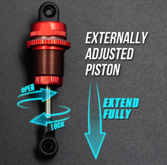 La scelta tra 1 e 5 fori aperti nel pistone vi permetterà di regolare l’ammortizzatore in base alle condizioni della pista. Il D-Bore è dotato di molle drift tuned nelle varianti soft e hard, perfette per il drift su superfici a bassa ed alta aderenza, mentre i tradizionali pistoni fissi sono inclusi nelle varianti a due, tre e quattro fori. Il corpo ammortizzatore è stato aggiornato per essere di tipo big-bore, che contiene più olio rispetto agli ammortizzatori tradizionali, il che offre una maneggevolezza molto più costante sia a basse che a temperature alte.