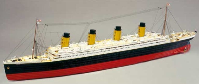 La mantua model non poteva non dedicare a questo mostro del mare, il TITANIC uno spazio importante nella propria collezione. Si è optato per la scala 1:200 1,35 mt. di lunghezza per circa 14 cm. di larghezza, prevedendo le due versioni: statica e navigante RC. Per rendere l’acquisto alla portata di tutti, l’opera è suddivisa in diverse tappe o kit costruttivi di prezzi più accessibili a tutti, quasi una vendita rateale. Il primo kit di base lo scafo, con la chiglia, le ordinate, i ponti ed il fasciame in legno, che incorniciano i ponti. Durante la costruzione dello scafo, il modellista dovrà decidere se scegliere la versione statica o quella navigante, acquistando il kit relativo.
