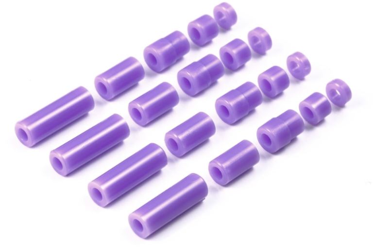 Versione in plastica dei distanziatori in alluminio dell’articolo 15473 JR Set di distanziatori in alluminio – 12 / 6,7 / 6 / 6 / 3 / 1,5mm. Ognuno è circa il 40% più leggero della sua controparte in alluminio. La loro plastica a basso attrito riduce al minimo la perdita di tempo per il contatto con le pareti del corso. Sono inclusi 20 distanziatori totali di 5 diversi spessori, che consentono di effettuare modifiche di impostazione di precisione alla vostra Mini 4WD.