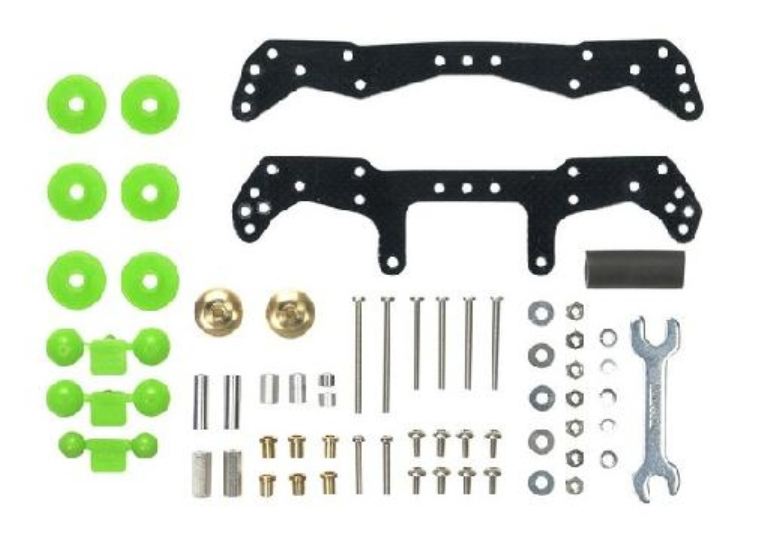 Il kit include: supporti in FRP anteriore e posteriore, rotelle da 13mm in plastica, mass damper e stabilizzatori a sfera. Compatibile con i telai: AR, MS, VS e Super XX