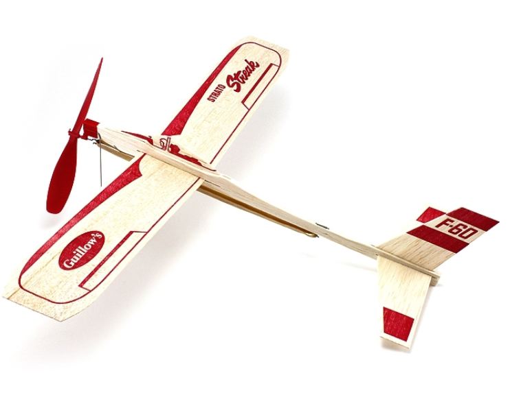 Il kit contiene: fusoliera, ala pre-tagliata e stampata già formata in verticale, coda e cabina pre-tagliate, elica con testa e fascio di gomma (gomma 3×1).