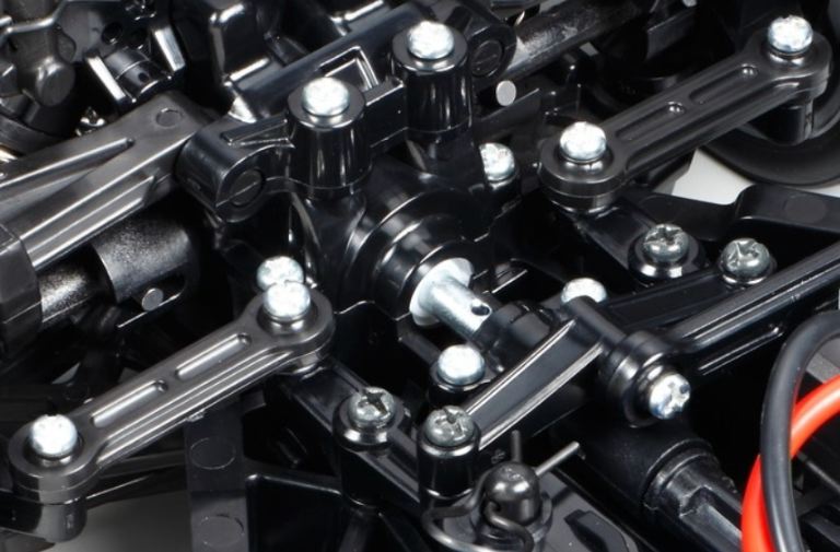 Il telaio TT-02 a 4WD è adattabile e bilanciato con trasmissione cardanica. Ua disposizione longitudinale con la batteria a sinistra e il motore a destra, offre un’eccellente stabilità. Inoltre, è dotato di bracci di sospensione e montanti sinistro e destro identici per un facile montaggio ed una limitata manutenzione.