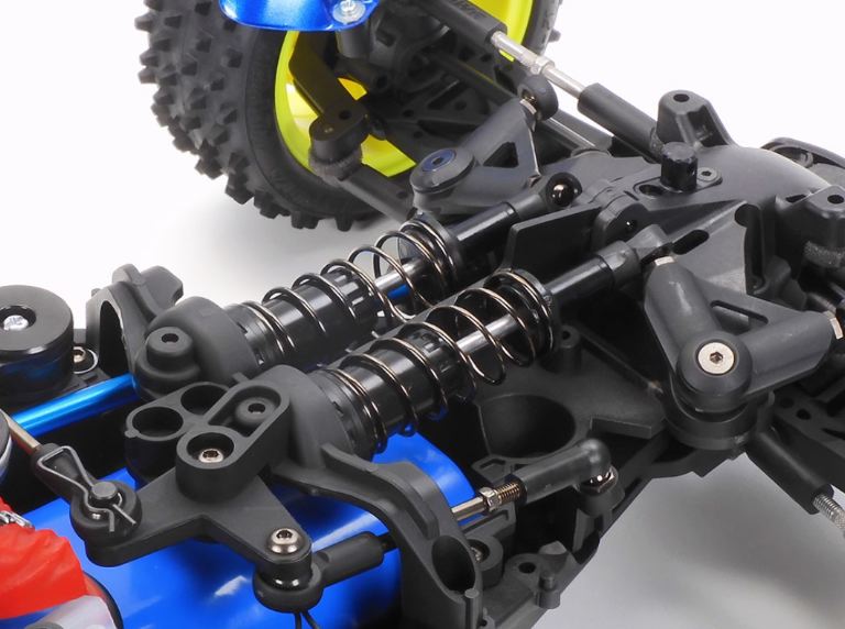Il TD4 è un telaio buggy 4WD con trasmissione ad albero che impiega sospensioni anteriori interne per una forma sottile e a basso profilo. È dotato di una posizione del pacco batteria longitudinale al centro e di un motore trasversale a metà nave per un equilibrio ottimale e prestazioni migliorate. La trasmissione utilizza cuscinetti pieni e i cambi anteriore/posteriore sigillati hanno differenziali a sfera incorporati. Due bielle e la pedivella trasmettono il movimento del servo sul lato sinistro alla configurazione del braccio dello sterzo in tre pezzi. Le sospensioni a doppio braccio oscillante indipendenti a 4 ruote utilizzano ammortizzatori ad olio CVA. I bracci superiori dell’albero del tenditore facilitano la regolazione dell’angolo di campanatura. Sono inclusi due tipi (alto/basso) di foderi alari e le ruote a stella sono abbinate a pneumatici a punta quadrata che offrono una presa superlativa fuoristrada.