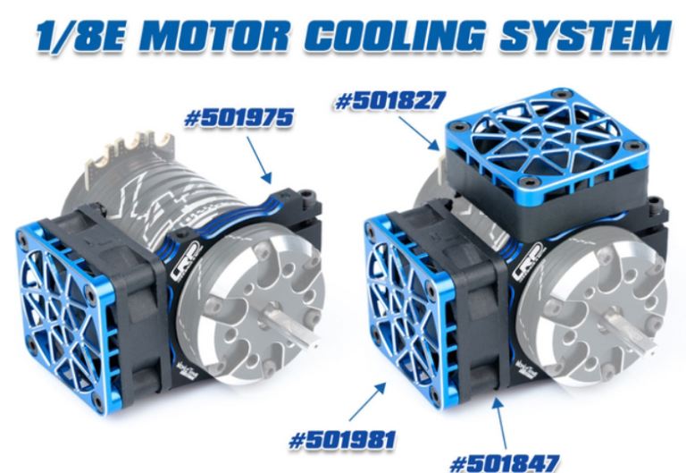 Il sistema di raffreddamento del motore 1/8E è composto dal nostro supporto per ventola in alluminio WorksTeam (#501975), dalle ventole del motore WorksTeam SuperHighRev. (#501847 / #501827) e dalla rete di sicurezza WorksTeam abbinata (#501981) per mantenere il motore fresco in qualsiasi condizione.
