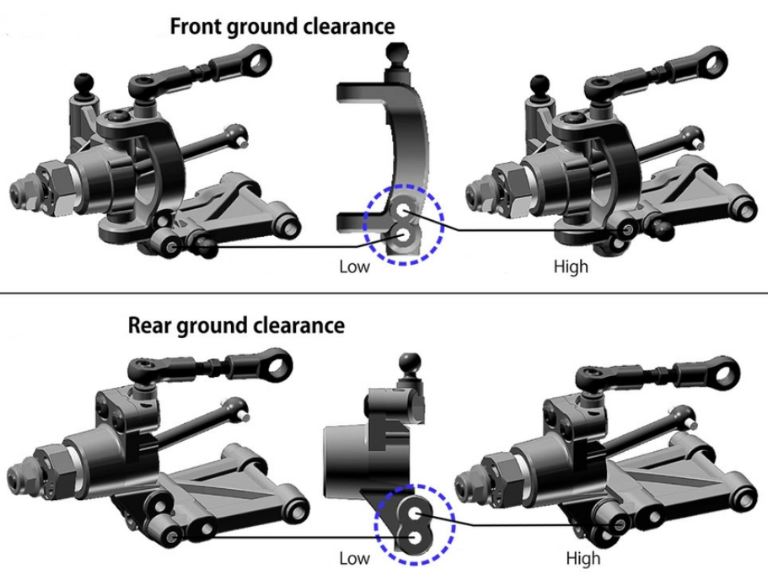 • I nuovi mozzi a C anteriori e i montanti posteriori, oltre ai bracci inferiori delle sospensioni consentono due tipi (circa 8mm o 13mm) di altezze da terra.