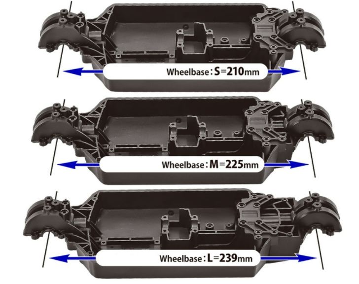 • La modifica della sezione posteriore consente di scegliere tra tre passi (corto: 210mm, medio: 225mm, lungo: 239mm).