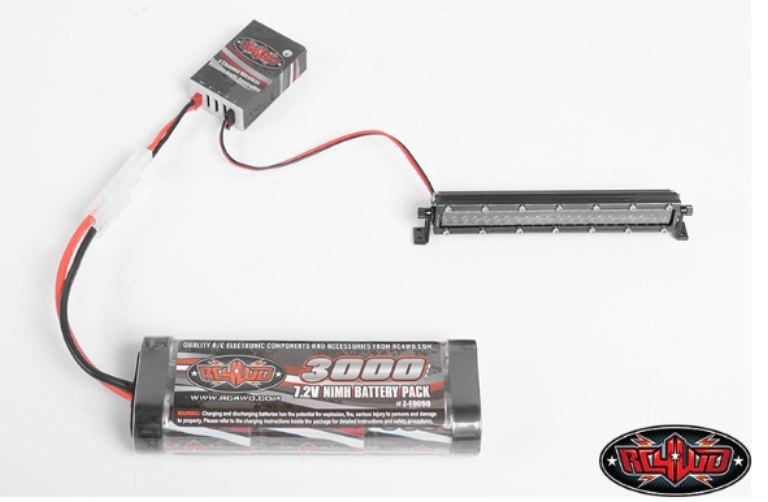 Indicato con il pacco batteria NIMH da 6 celle 3000mAh RC4WD ( Z-E0090 ) e la barra luminosa LED ad alte prestazioni K1 10C HiLiTES serie C 10/10 ( Z-E0059 ) ad esempio (non incluso)