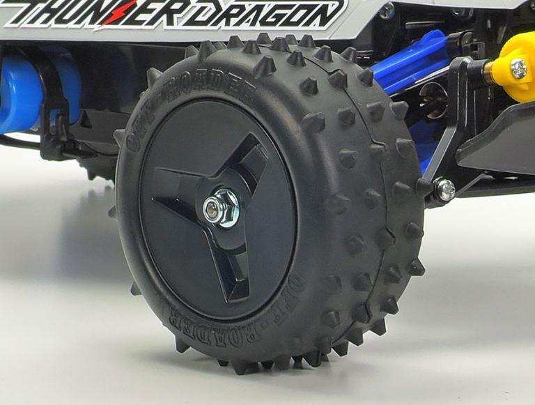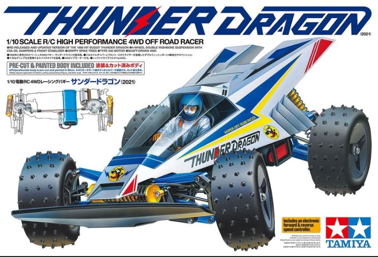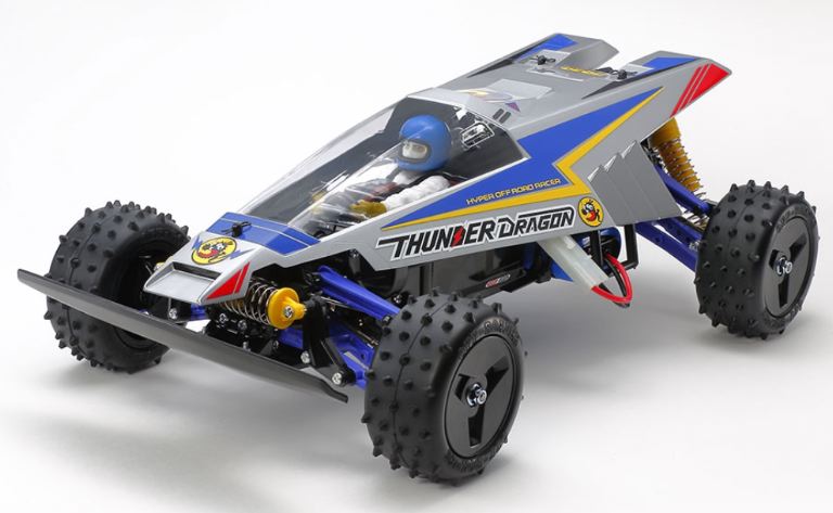 Riedizione del classico buggy R/C Thunder Dragon, apparso in un cartone animato giapponese negli anni ’80. Il telaio della vasca in ABS è resistente e consente una facile manutenzione, mentre le sospensioni a doppio braccio oscillante a 4 ruote utilizzano ammortizzatori ad olio CVA e uno stabilizzatore anteriore per una guida superiore. I cambi sigillati anteriori e posteriori contengono differenziali con tipi a 3 smussi pressofusi per una sensazione di guida fluida e superiore e pneumatici chiodati semi-pneumatici per un’ottima presa. Il corpo aerodinamico è stampato in policarbonato, con sezioni non capote verniciate in argento. È pretagliato per comodità.